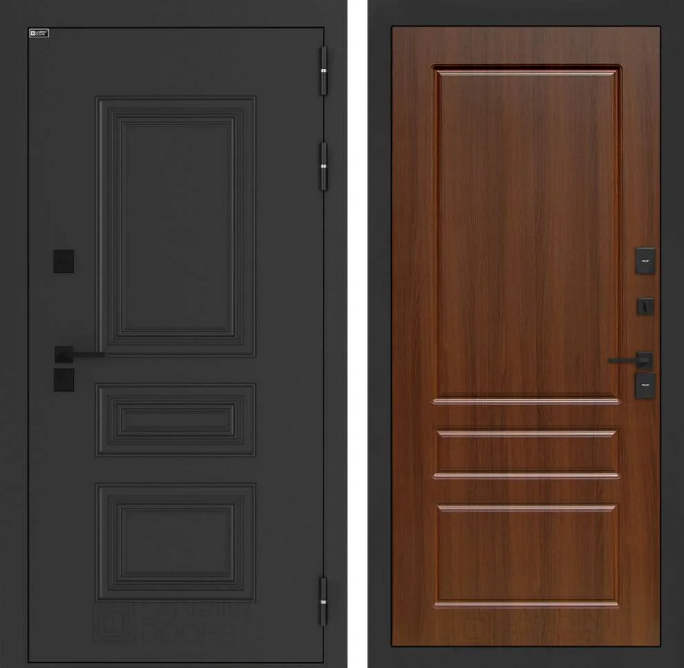 Дополнительные преимущества: три скрытые петли на подшипниках, два противосъемных ригеля, полный комплект черной полимерной фурнитуры, включая накладки, ручку, задвижку и металлический эксцентрик, увеличенный наличник 100 мм.