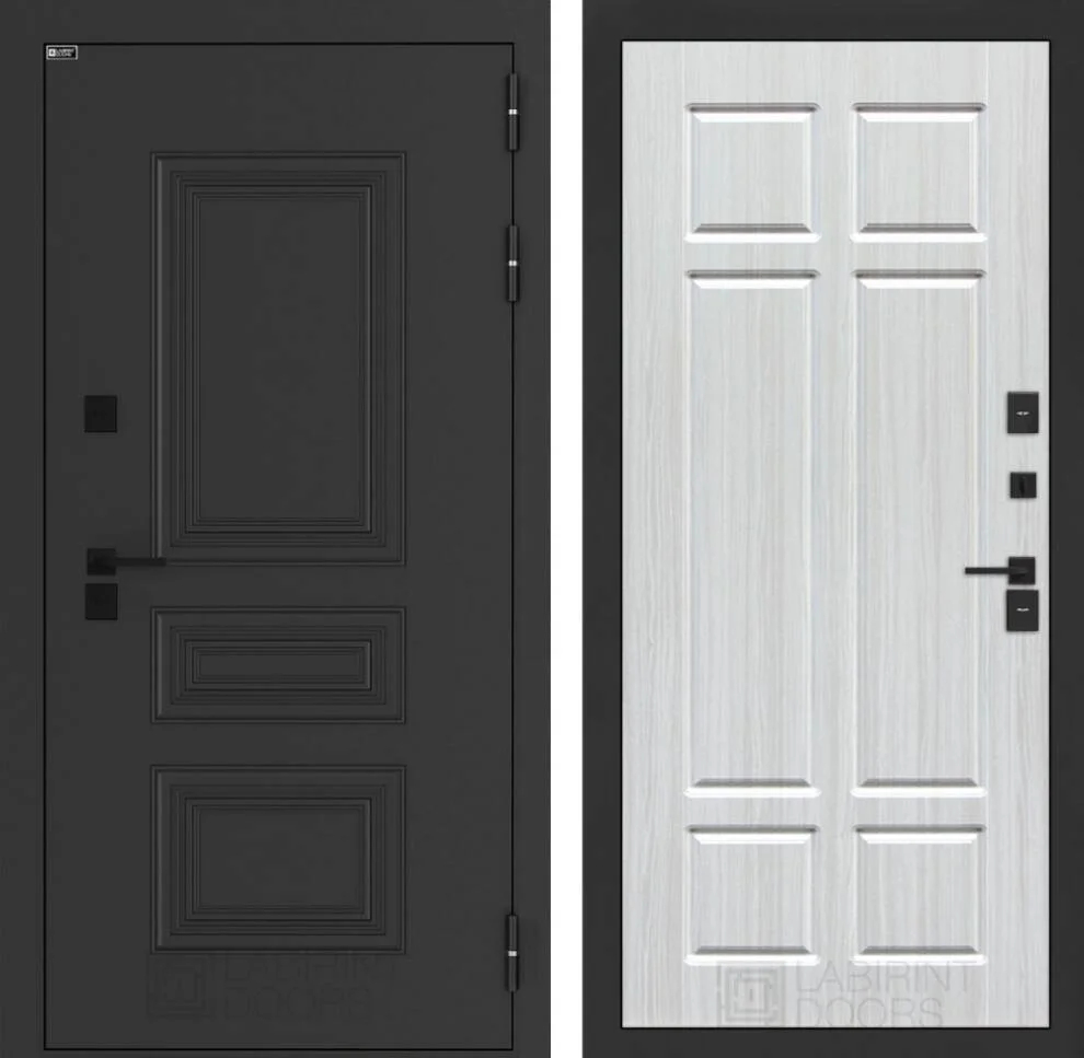 Эстетичный внешний вид входной двери создается благодаря металлической отделке методом давления и 2-слойному покрытию с муаром черного цвета.