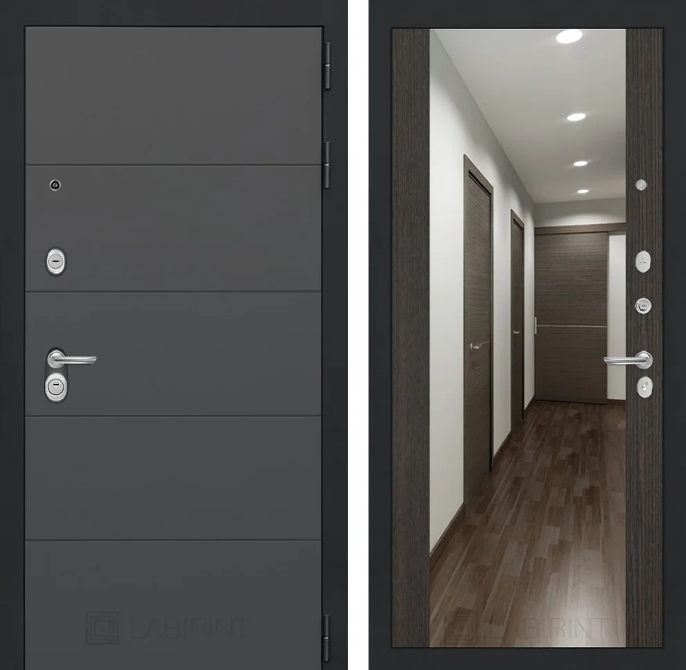 Дизайн двери гармоничен: снаружи современная МДФ панель цвета "Графит софт" с элегантным металлическим наличником в стиле "Муар" серый, внутри — широкое зеркало в панели цвета "Венге", визуально расширяющее пространство прихожей.