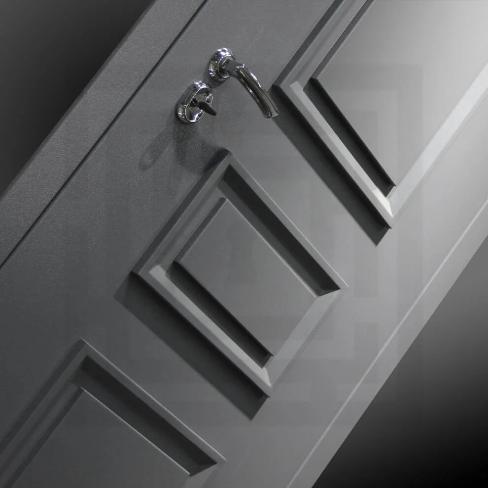 Металлическая 3D филенка снаружи с покрытием RAL 7024 (шагрень) выглядит презентабельно.