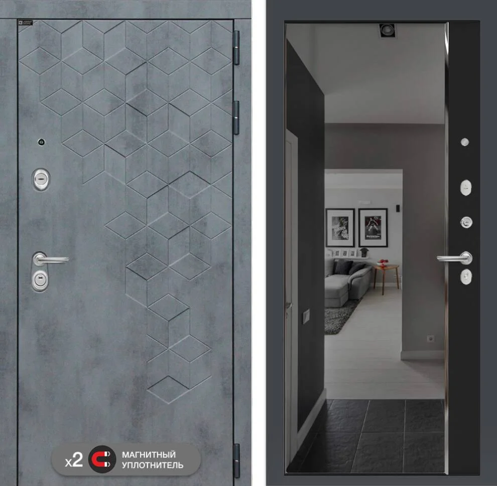 Входная дверь Бетон с зеркалом Панорама с тонировкой в цвете Черный кварц - это современное решение для защиты вашего дома, сочетающее стильный дизайн с надежной безопасностью.
