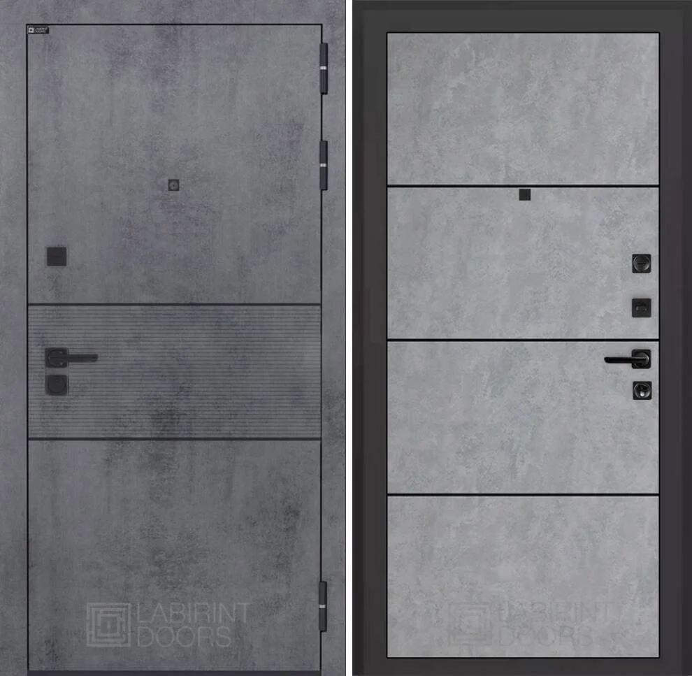 Снаружи – МДФ панель с отделкой "Бетон темный" и элегантным чёрным молдингом, внутри – светлая отделка "Бетон светлый" с чёрным молдингом.