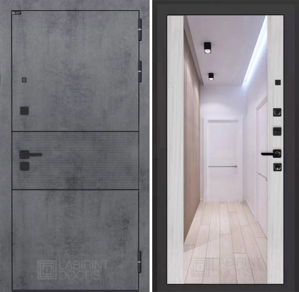 Снаружи дверь отделана МДФ панелью 10 мм темно-бетонного цвета с черным молдингом, что создает строгий и элегантный образ.