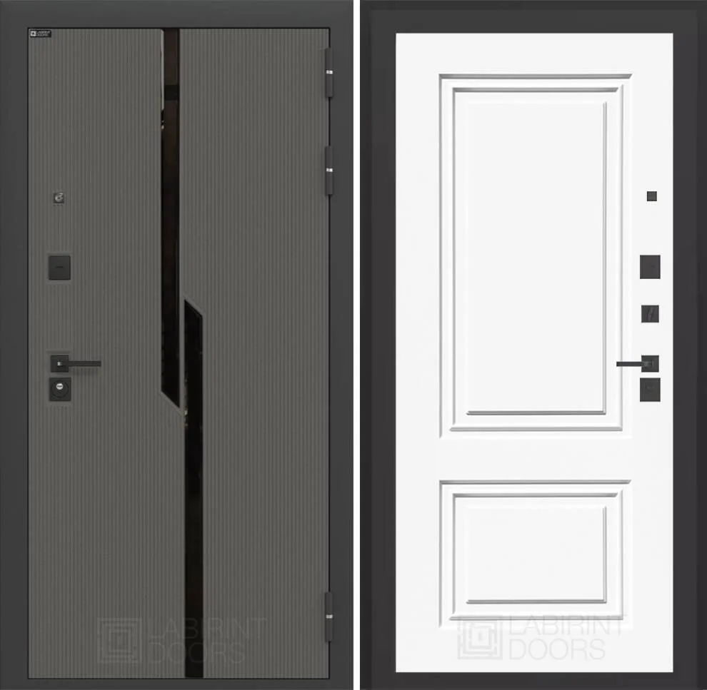 Снаружи — декоративная МДФ панель с черным стеклом фацет в цвете "Лофт графит" с металлическим наличником и черным муаром.