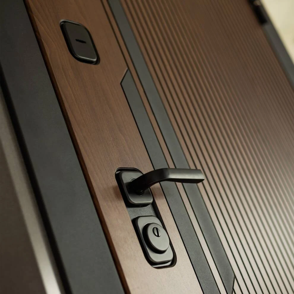 В комплект входит вся необходимая фурнитура черного цвета: врезная броненакладка, накладка со шторкой, глазок, ручка и ночная задвижка.