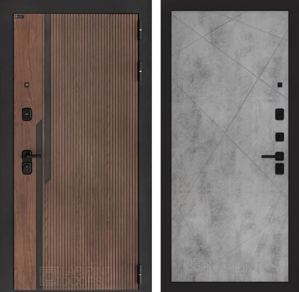 Отделка снаружи выполнена фрезерованной МДФ панелью в цвете "Орех американский" с элегантной патиной и металлическими вставками, а внутренняя сторона украшена декоративной панелью в стиле "Бетон светлый".
