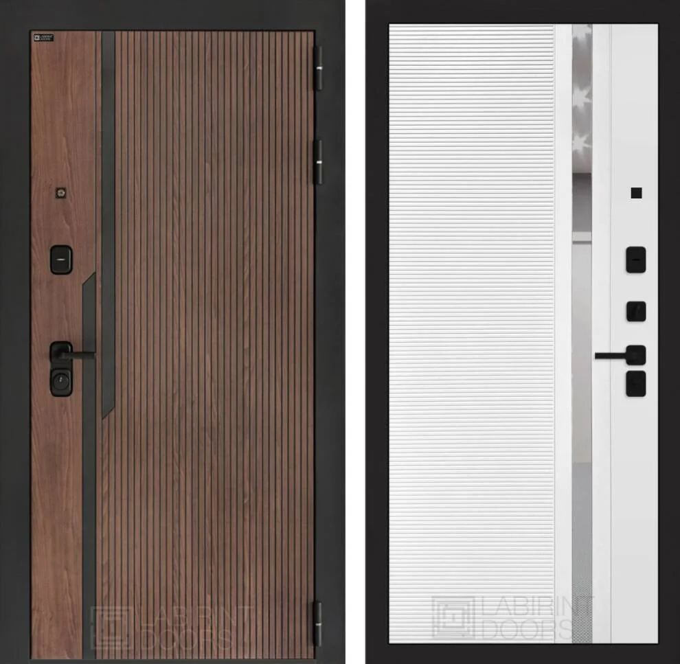 Модель комплектуется тремя скрытыми петлями на подшипниках, двумя противосъемными ригелями и полным набором фурнитуры в черном цвете: броненакладкой, накладкой со шторкой, глазком, ручкой и ночной задвижкой.