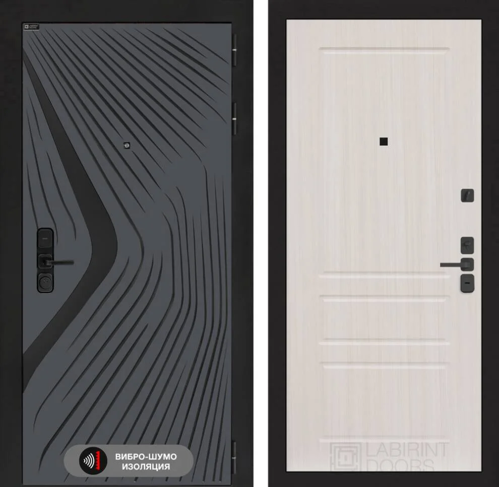 Дизайн двери поражает контрастным решением: снаружи - фрезерованная МДФ панель "Веллюто Оскуро" с патиной и металлической вставкой на фоне черного муара, внутри - благородный "Сандал белый" с изысканной фрезеровкой.