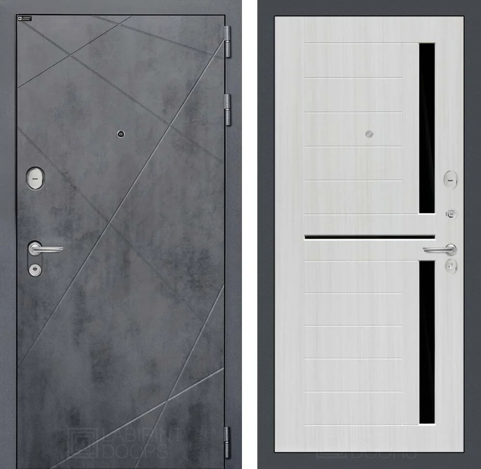Эстетика модели Лофт 02 подчеркивается фрезерованной МДФ панелью снаружи в цвете "Бетон темный" с металлическим наличником и покраской металла "Молоток серый".