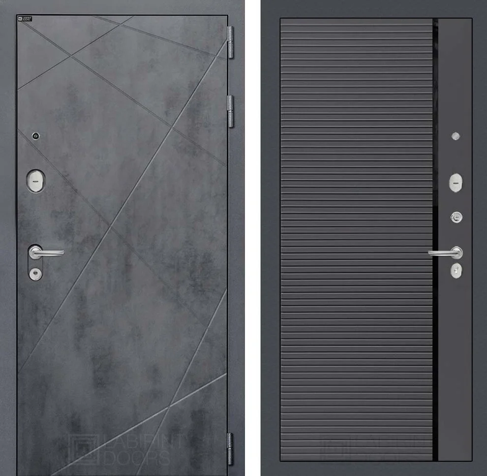 Снаружи дверь украшена фрезерованной декоративной МДФ панелью (10 мм) в цвете "Бетон темный" с металлическим наличником.