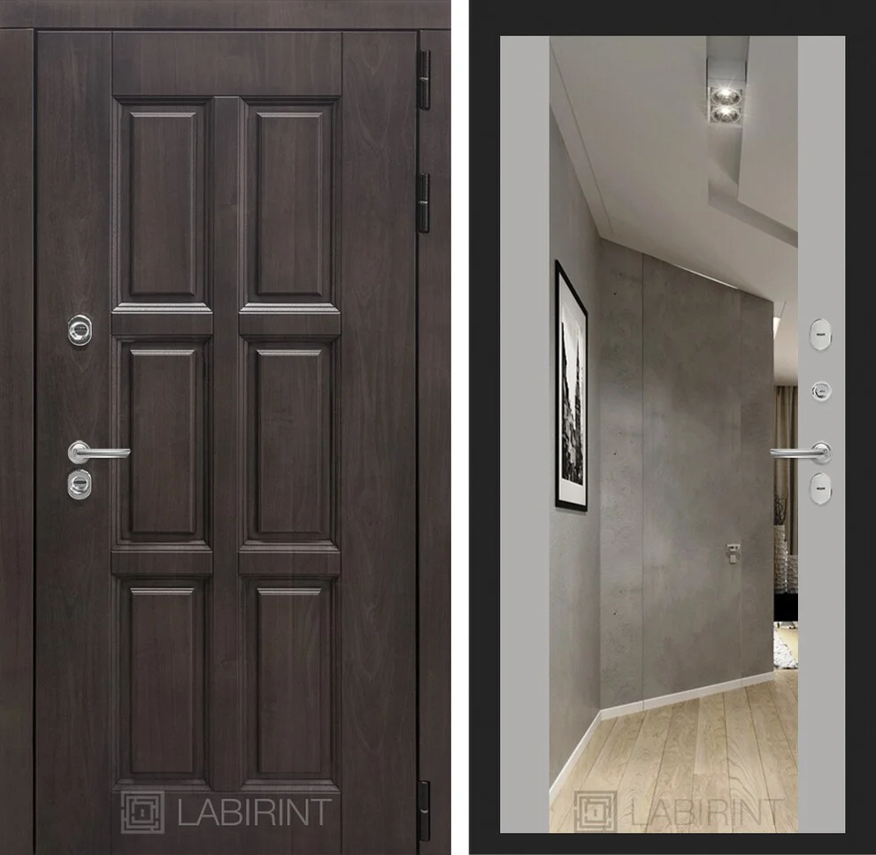 Внутренняя сторона украшена декоративной панелью с широким зеркалом, визуально расширяющим пространство прихожей.
