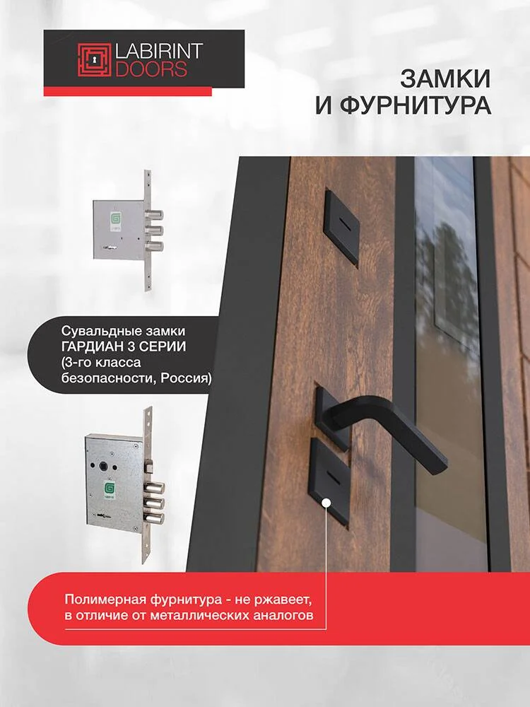 Безопасность гарантируют два сувальдных замка Гардиан 3-го класса защиты (российского производства), два противосъемных ригеля и скрытые подшипниковые петли.
