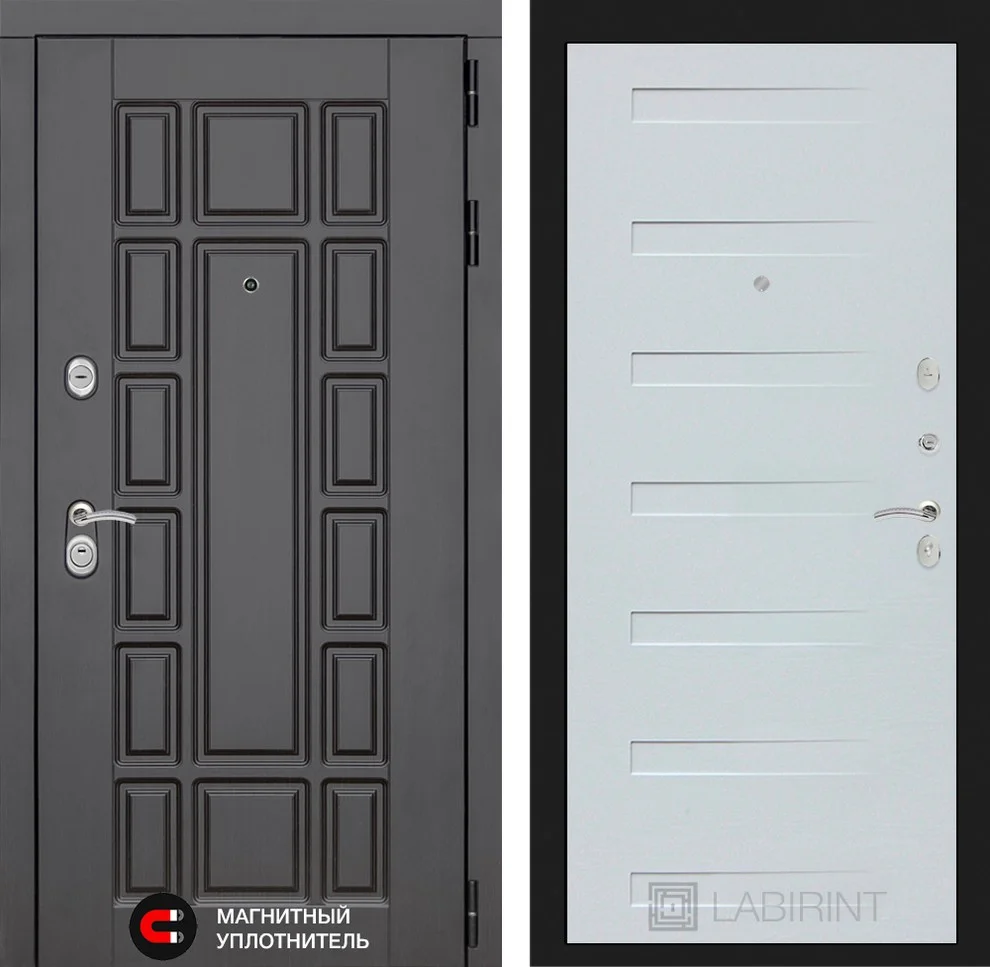 Дизайн входной двери Нью-Йорк 14 отражает современные тренды: внешняя МДФ панель 16 мм цвета "Венге" создает строгий, элегантный вид, а внутренняя панель из "Дуба кантри белого горизонтального" гармонирует с интерьером.