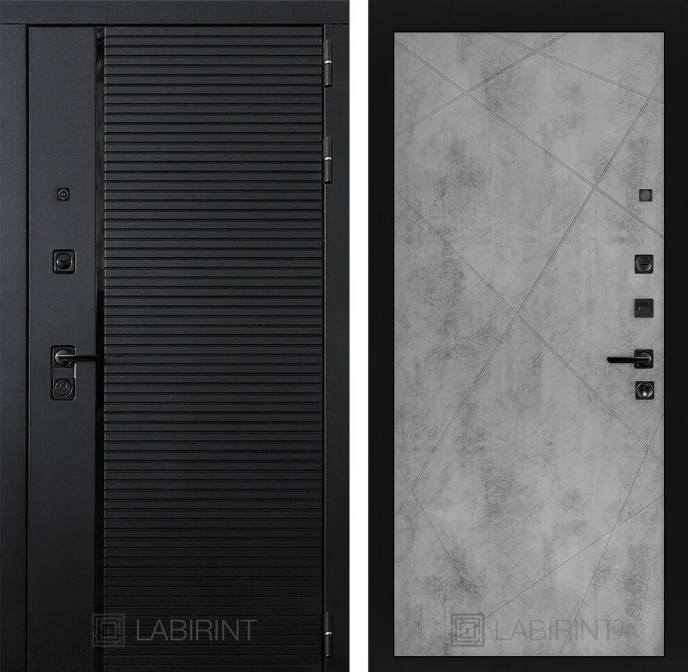Дизайн модели поражает элегантностью: внешняя МДФ панель в цвете «Черный кварц» с черным молдингом и шагреневой покраской металла создает стильный контраст с внутренней отделкой «Бетон светлый».