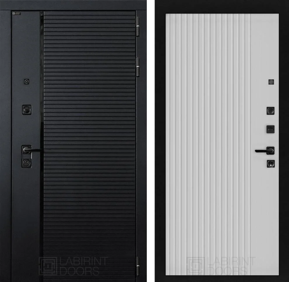 Дизайн модели поражает контрастным сочетанием: снаружи дверь украшает декоративная МДФ панель «Черный кварц» с элегантными черными молдингами на фоне шагреневой покраски металла, а внутренняя сторона выполнена в благородном цвете «Белый софт рельеф» с изысканной фрезеровкой.