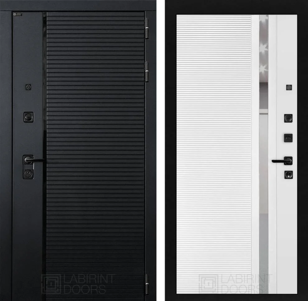 Внешний вид двери поражает элегантностью: снаружи - декоративная МДФ панель в цвете "Черный кварц" с черным молдингом, изнутри - фрезерованная панель "Белый софт" с эксклюзивной зеркальной тонированной вставкой.