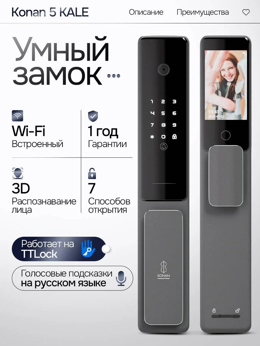 Основное преимущество двери - инновационный электронный замок Конан 5Кале с Wi-Fi модулем, который позволяет управлять входом дистанционно через смартфон.