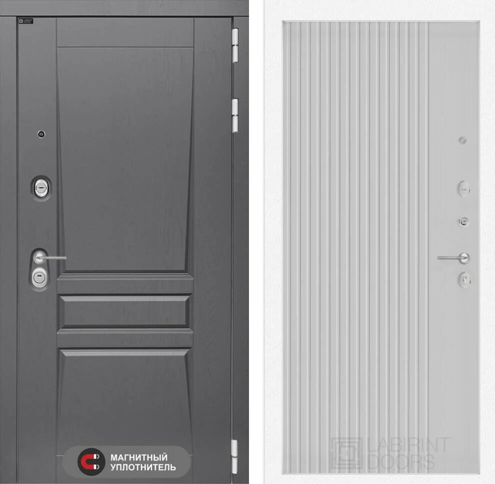 Эстетика двери впечатляет благодаря комбинированной отделке: снаружи – декоративная МДФ панель 16 мм цвета Альберо Грей, внутри – декоративная МДФ панель 10 мм с рельефной фрезеровкой белого цвета софт.