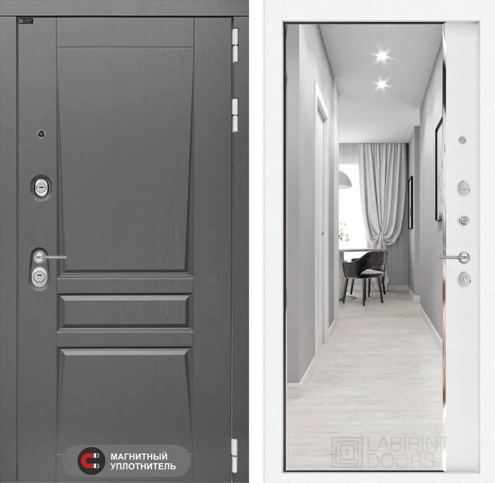 Входная дверь Платинум с зеркалом Панорама в белом софте — это премиальное решение для защиты вашего дома.