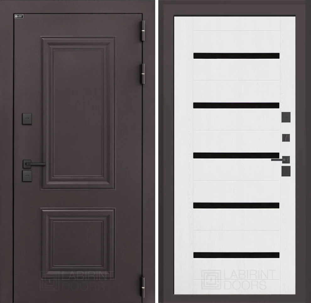 Эстетичный внешний вид входной двери создается декоративной МДФ панелью 12 мм с фрезеровкой цвета "белое дерево", чёрным стеклом и увеличенным металлическим наличником 100 мм.