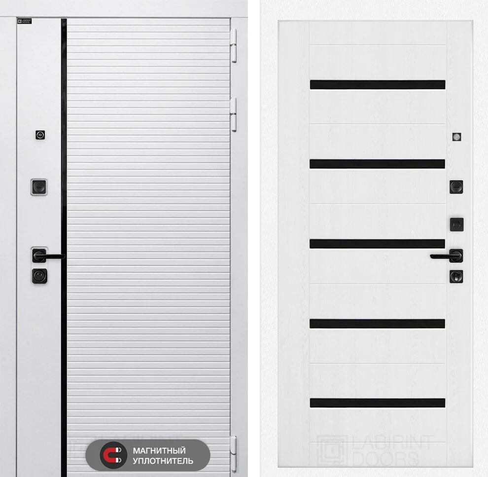 Стильная отделка привлекает внимание: снаружи – современная МДФ панель "Лофт белый" с черным молдингом, внутри – декоративная панель "Белое дерево" с фрезеровкой и элегантным черным стеклом.