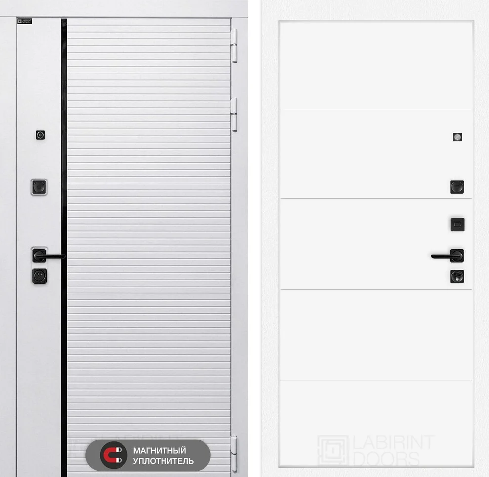 Отделка Роял 13 Белый софт выполнена в современном стиле: снаружи – МДФ панель «Лофт белый» с черным молдингом и белой шагренью по металлу, внутри – декоративная панель «Белый софт» с изысканной фрезеровкой.