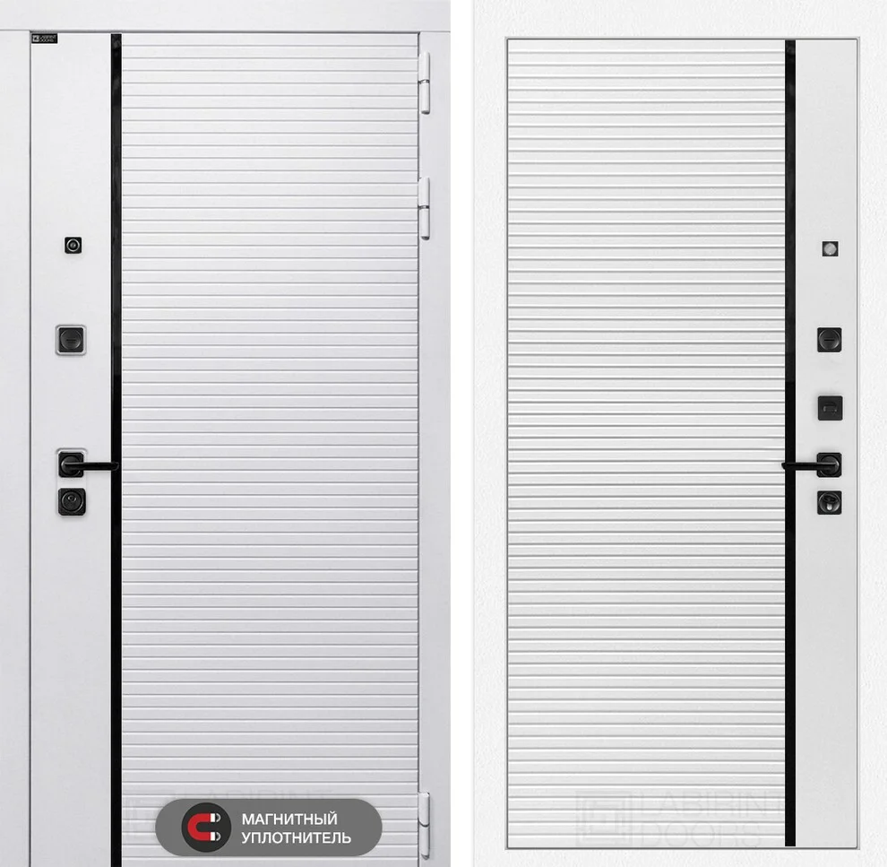Наружная панель в цвете «Лофт белый» дополнена чёрным молдингом, внутренняя – в оттенке «Белый софт» также с контрастной чёрной вставкой.