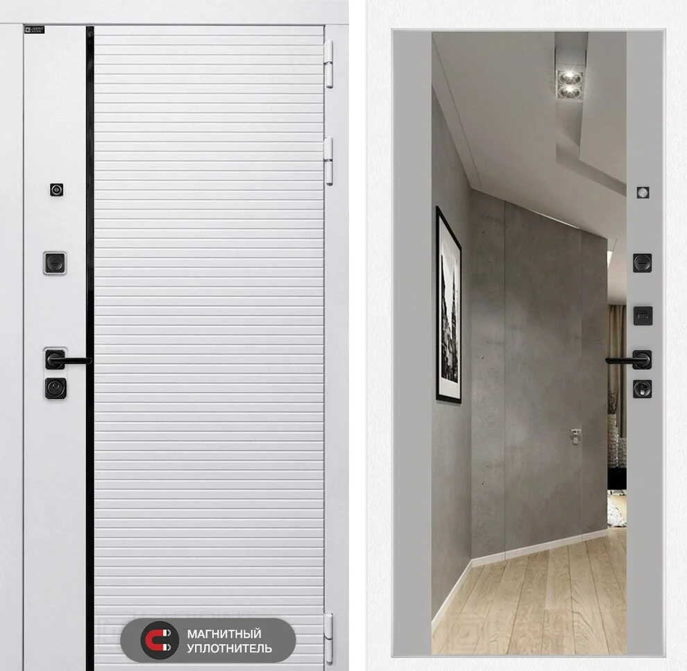 Внешний вид двери впечатляет стильным сочетанием цветов: снаружи – лофт белый с черным молдингом, внутри – элегантный софт грей с широким зеркалом, которое визуально расширяет пространство прихожей.