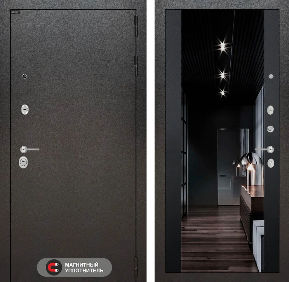Внешняя отделка из металла с покрытием «Антик» темное серебро придает двери элегантный вид, а внутренняя декоративная МДФ панель 13 мм с тонированным зеркалом в цвете Черный кварц создает визуальный объем и современный интерьер.