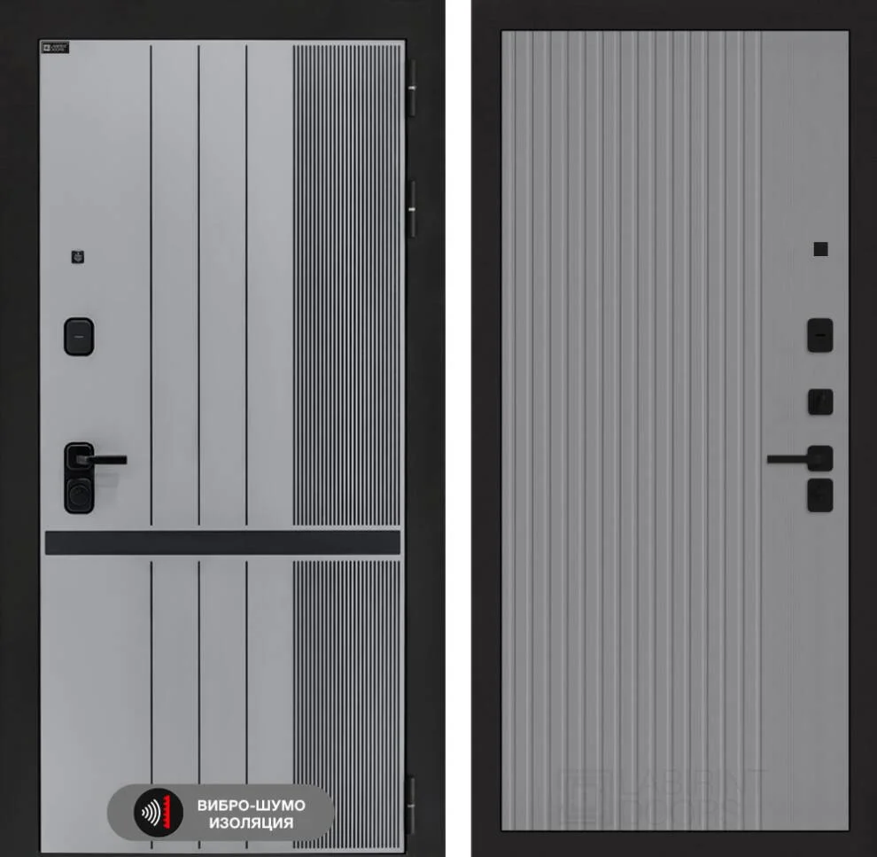 Дизайн входной двери Скайлаб 29 отличается элегантностью: серый софт рельеф снаружи с фрезерованной МДФ панелью, металлическая вставка в цвет наличника, черный муар покраски.