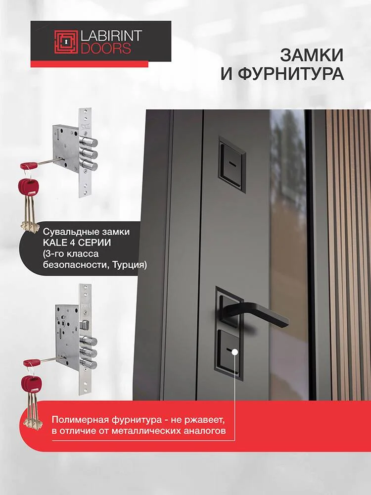 Безопасность гарантирована двумя сувальдными замками KALE 3-го класса защиты турецкого производства, дополненными двумя противосъемными ригелями.
