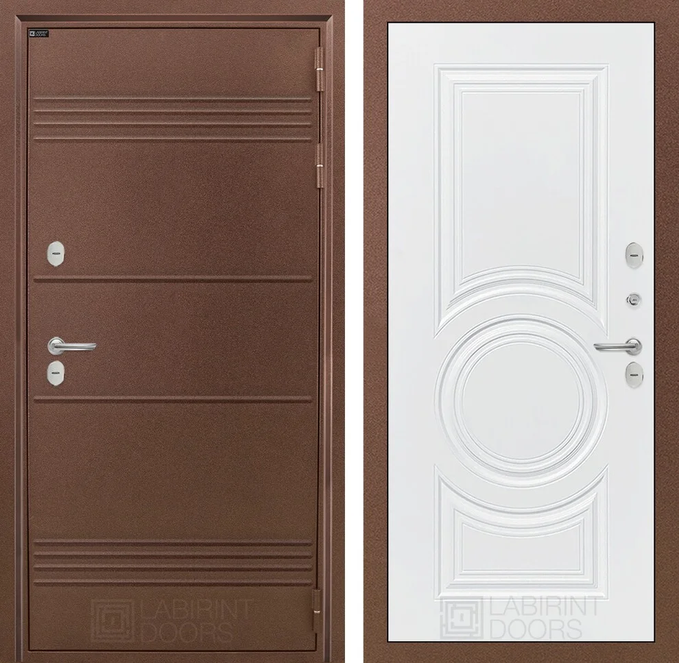 Внешний вид двери поражает своим благородством: металлическая отделка с давлением и фигурный наличник, двухслойное защитное покрытие с цинкосодержащим грунтом и покраской "Антик" медный цвет.