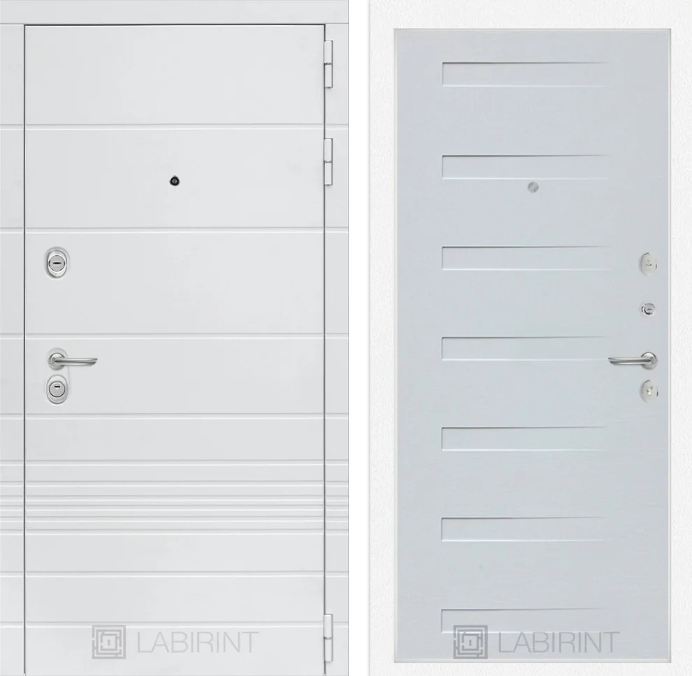 Внешняя отделка выполнена из декоративной МДФ панели цвета "Лофт белый" с фрезерованным наличником, а внутренняя сторона украшена горизонтальным рисунком "Дуб кантри белый", придающим интерьеру натуральность и теплоту.