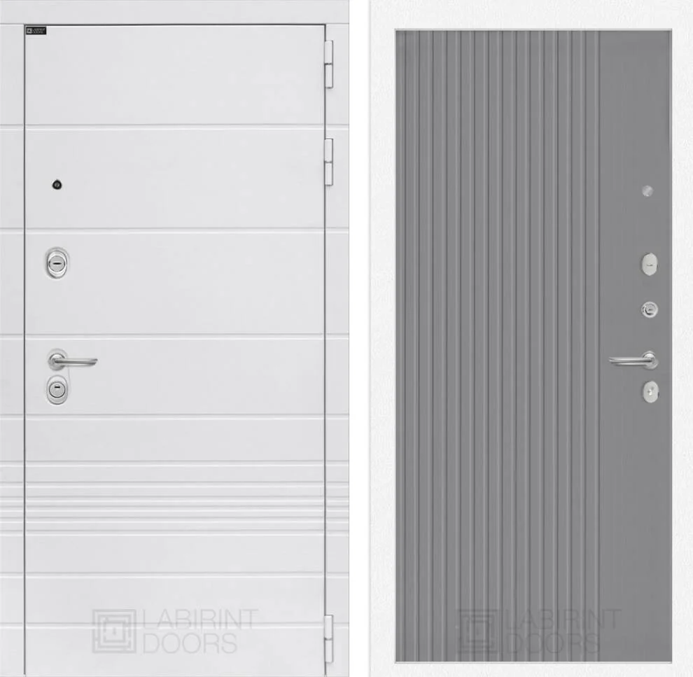 Дизайн модели отличается стильным сочетанием: снаружи элегантная декоративная МДФ панель 10 мм "Лофт белый" с фрезерованным наличником, внутри - декоративная панель "Серый софт рельеф" с фрезеровкой.
