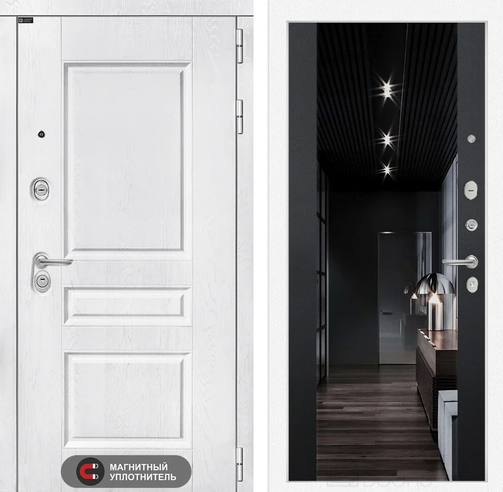 Художественное оформление входной двери сочетает классику и современность: снаружи — МДФ панель с наличником цвета "Альберо браш серебро", внутри — декоративная панель с тонированным зеркалом "Черный кварц", которое визуально расширяет пространство и добавляет стиля прихожей.